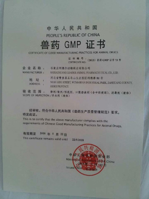 利德爾藥業(yè)有限公司新基地于2013年5月22號通過認(rèn)證,公司擁有一整套達到GMP標(biāo)準(zhǔn)的生產(chǎn)設(shè)備、檢驗儀器和完善的質(zhì)量保證體系,公司擁有粉劑、散劑、預(yù)混劑、口服溶液劑(中藥提取液)、消毒劑、殺蟲劑等生產(chǎn)線,已全部通過獸藥GMP認(rèn)證。