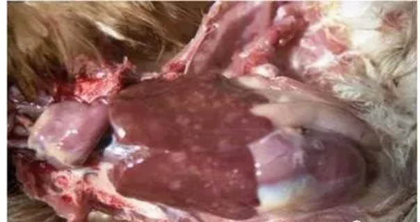 3、肝表面有灰黃色和灰白色結(jié)節(jié)或腫瘤———馬立克氏病、淋巴細(xì)胞白血病、結(jié)核病。