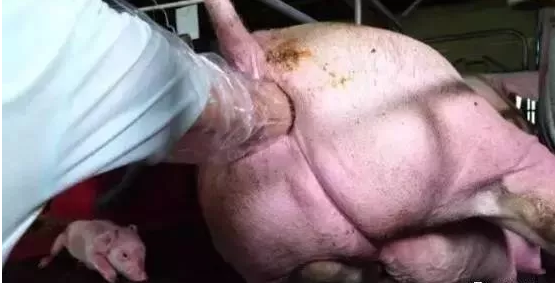 用肥皂水徹底清洗手臂后,再用冷開水沖洗掉肥皂水,往手臂上涂滿專用的潤滑劑(也可帶上一次性無菌長臂手套涂上潤滑劑),然后五指并攏(剪短指甲不要劃破產道),隨手輕輕在產道旋轉,慢慢伸進產道,摸到小豬卡在子宮口,如果是摸到頭,可以把五指分開,食指跟中指放在小豬2個耳后,大拇指無名指小拇指并攏,慢慢將小豬帶出來。