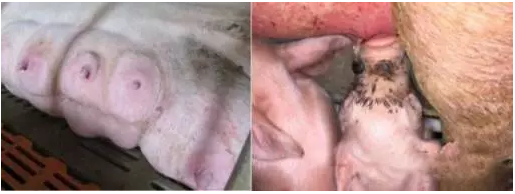 當(dāng)夏季環(huán)境溫度較高時(shí),母豬體內(nèi)溫度較高,血液主要供給皮膚毛細(xì)血管進(jìn)行散熱,而進(jìn)入乳房的血流量減少,營(yíng)養(yǎng)供給減少,從而導(dǎo)致產(chǎn)奶量降低。產(chǎn)奶量降低表現(xiàn)為:母豬乳房周圍有明顯的黑圈,仔豬額頭有黑色污漬。如下圖