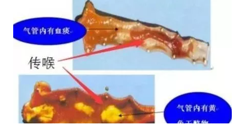 顧名思義,傳喉的主要發(fā)病部位在喉部,傳支的發(fā)病部位在支氣管。就發(fā)病部位而言,傳喉在呼吸道的上端,傳支在呼吸道的下端。另外,病雞感染傳喉后,剖檢病死雞,鼻腔嚴(yán)重充血、出血、有多量鼻液。病雞喉頭、氣管上1/3黏膜潰爛出血、有針尖樣出血點(diǎn),氣管內(nèi)有多量血痰。