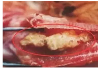 慢性傳喉病例的喉頭或上1/3氣管有黃白色干酪物堵塞。感染傳支的病死雞,則在氣管的下1/3、支氣管有漿液性或黃白色干酪樣物堵塞,尤其在氣管和支氣管交叉口常常形成“人字形”黃色干酪物堵塞。