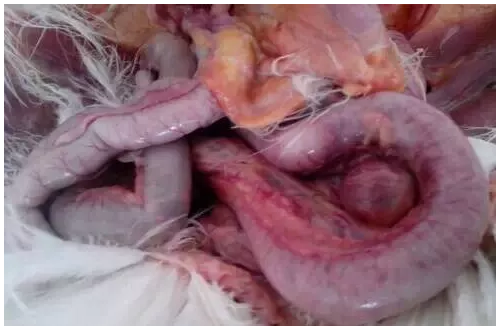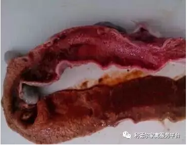 病變主要在小腸,尤其是空腸和回腸部分;小腸顯著腫粗至正常的2~3倍,擴(kuò)張、充滿氣體;腸壁充血、出血或因附著黃褐色偽膜而肥厚、脆弱。剝?nèi)文た梢娔c粘膜有卡他性炎到壞死性炎的各種變化;腸內(nèi)容物少而呈白色、黃白色或灰白色,有的病例成血色或黑紅色并有惡臭。早期感染病例只能見到回腸、直腸段腸粘膜有米粒大小、似痱子狀壞死灶,這類雞主要怕表現(xiàn)為水瀉。