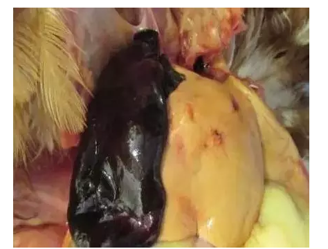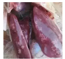 癥狀:排出白色水糞,雞冠蒼白、肝臟腫脹、褪色、易碎、肝臟上斑駁狀出血。腎臟和脾臟腫脹,有出血點。