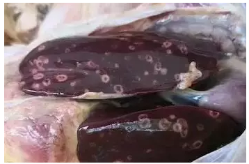 盲腸腫大、腸壁增厚,腸道內容物變干,形成干酪樣壞死塊。肝臟腫大,表面有圓形、邊緣隆起、中間凹陷的潰瘍灶。