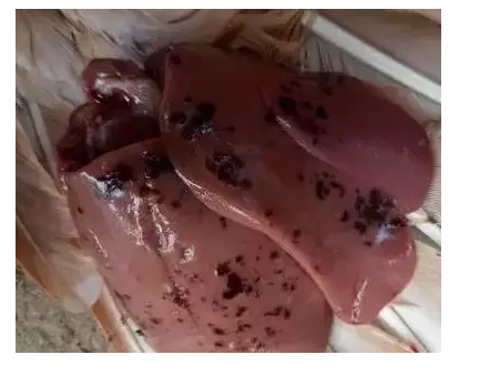 癥狀表現(xiàn):剖檢后發(fā)現(xiàn)一肚子血水、肝破裂,肝腫大、蒼白或呈土黃色,肝表面和實質內有黃色、星芒狀的小壞死點,布滿菜花樣的壞死區(qū),或者肝被膜下有血腫。防治措施:加強飼養(yǎng)管理,改善雞舍衛(wèi)生條件。飼料中添加肝腎康,連用3-5天。做好飼養(yǎng)管理,加強室內帶雞消毒。