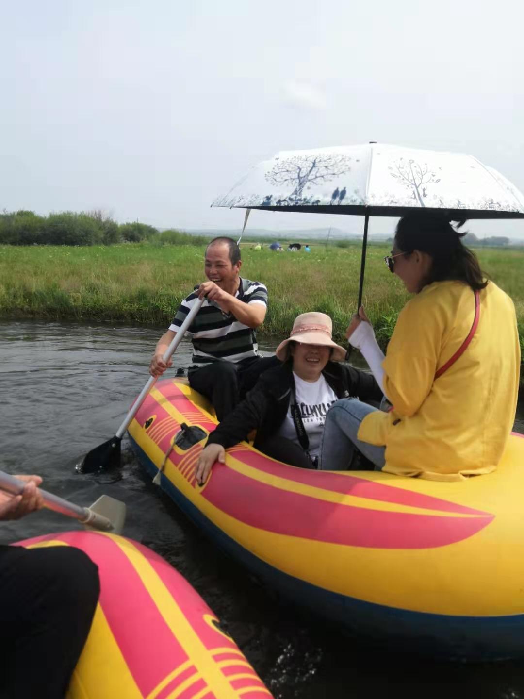 漂流開始,水流很緩,可以瀏覽沿途風(fēng)景,不經(jīng)意間貌似一盆水從天而降,原來是同事的船已靠近,用水偷襲我們,隊友開始還擊,一場水上作戰(zhàn)就此打開,原來保持矜持的尖叫,到渾身濕透的激烈反擊,一條船,兩條船,多條船,在原地打起了水仗,水花四起,后勤做飯的王姐,平日的老實人,在這里也揮起了大手掌,快速的從河里撈起水,撒向?qū)Ψ剑」媚飩冋屑懿蛔,只喊投降,有的干脆跳在水里作?zhàn),尖叫聲,潑水聲,笑聲一片......,有的船只直接打翻,全部隊友掉落水里,更有船只把另一個船上的隊友直接水上劫持,拖到自己的船上去,到達(dá)岸邊,還在戀戰(zhàn),全然不顧濕透的衣服鞋子,如果不親身體驗,很難感受當(dāng)時的氣氛。接著是滑沙,坐上越野車,穿越3公里,路過駱馬湖,觀看草原湖泊的獨特美景,可以看各種稀有水鳥,來到滑沙現(xiàn)場,從沙坡上直接滑下的刺激,大人小孩,來回的往返幾次。自由滑落,驚恐中帶著神經(jīng)的刺激,伴著刺耳的尖叫聲,由上而下滑落。