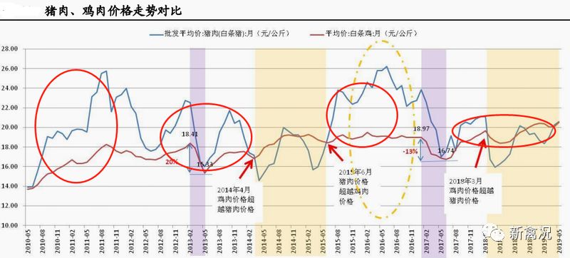 一直以來,豬肉與禽肉等其他肉類存在一定的替代關(guān)系,而這種“替代效應(yīng)”從價(jià)格上的變化最為直觀。從2010-2019年間豬肉和雞肉之間的價(jià)格走勢(shì)可以看出,雞肉、豬肉價(jià)格之間存在一定正相關(guān)關(guān)系。