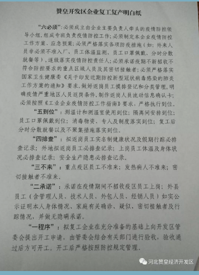 隨著春節(jié)假期結(jié)束,企業(yè)復(fù)工在即,防控疫情攻堅戰(zhàn)依然持續(xù)。為促進園區(qū)各企業(yè)盡快復(fù)工,贊皇經(jīng)濟開發(fā)區(qū)總結(jié)了企業(yè)復(fù)工復(fù)產(chǎn)應(yīng)做的各項工作,并印發(fā)了企業(yè)復(fù)產(chǎn)復(fù)工明白紙,希望各企業(yè)切實按要求執(zhí)行,盡快安全有序復(fù)工。