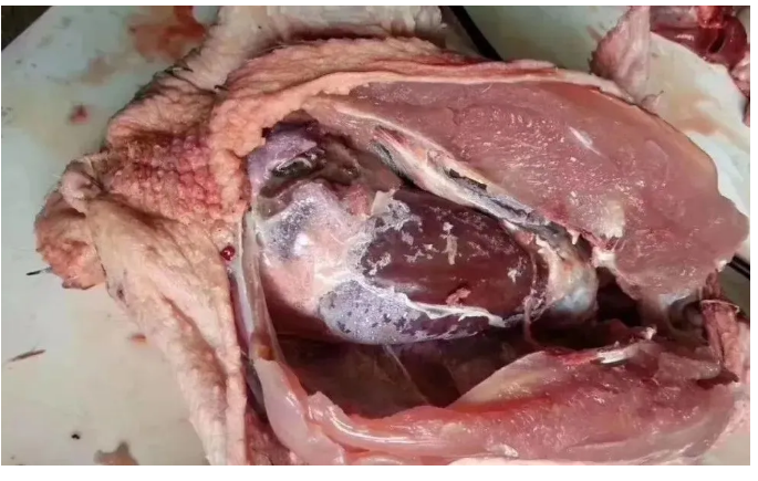 頭頸部皮下出血充血,胸腺腫脹, 胸腺連接的血管感染到心窩處,心冠脂肪充血后,出現(xiàn)心包集液,繼而出現(xiàn)心包纖維化,胸氣囊纖維化,肝臟漿膜纖維化,出現(xiàn)包心包肝現(xiàn)象。(2)辨證分析:皮毛郁結(jié)逆?zhèn)餍母,多為風(fēng)寒風(fēng)熱感冒和慢性流感造成。
