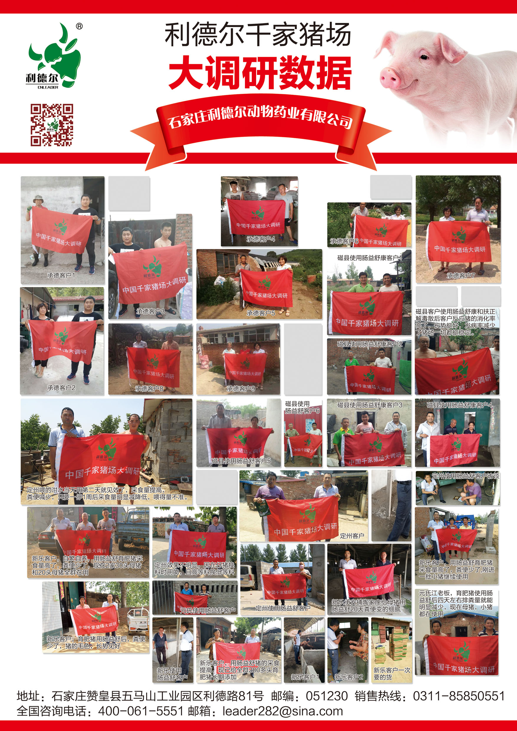 腸益舒投放市場將近半年時間,市場遍布石家莊周邊,唐山、承德,邯鄲,山東、東北,河南,廣東,福建等地,利德爾藥業(yè)本著對客戶負責,對用戶負責的精神!利德爾千家豬場大調(diào)研正在進行中,我們已經(jīng)走訪了承德,石家莊周邊和邯鄲部分縣區(qū),雖然今年的養(yǎng)豬行情不如去年,但是養(yǎng)豬戶還是很積極的在擴建,怎樣把豬養(yǎng)好。通過市場走訪,養(yǎng)殖戶對公司的腸益舒評價非常高: