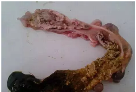 病變主要在小腸,尤其是空腸和回腸部分;小腸顯著腫粗至正常的2~3倍,擴(kuò)張、充滿氣體;腸壁充血、出血或因附著黃褐色偽膜而肥厚、脆弱。剝?nèi)文た梢娔c粘膜有卡他性炎到壞死性炎的各種變化;腸內(nèi)容物少而呈白色、黃白色或灰白色,有的病例成血色或黑紅色并有惡臭。早期感染病例只能見到回腸、直腸段腸粘膜有米粒大小、似痱子狀壞死灶,這類雞主要怕表現(xiàn)為水瀉。